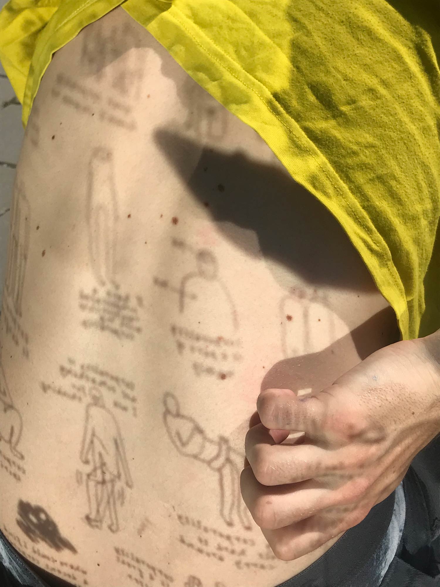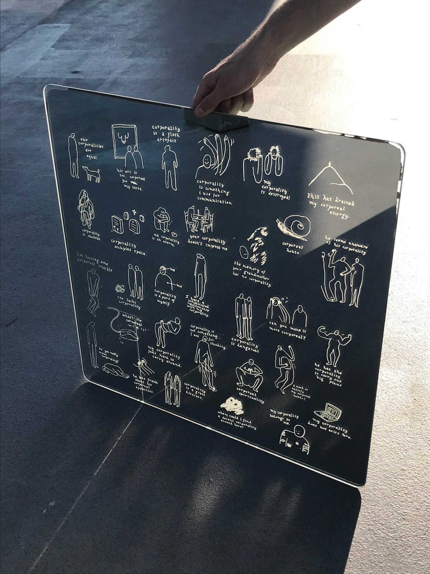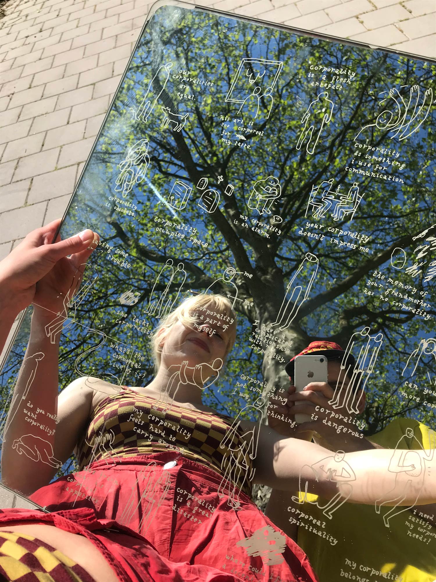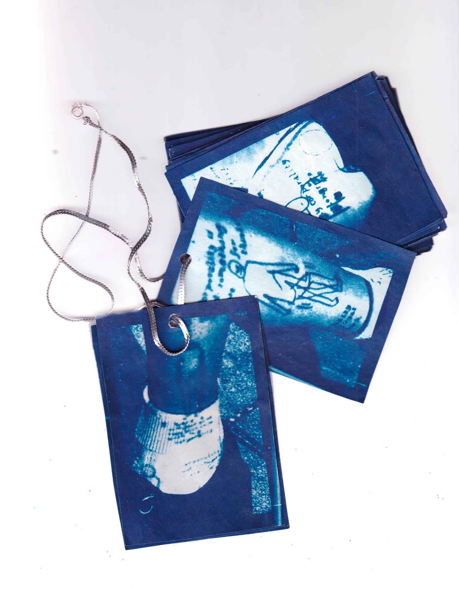 Mirror and cyanotype–printed book/necklace exploring the meaning of the word "corporeality".
