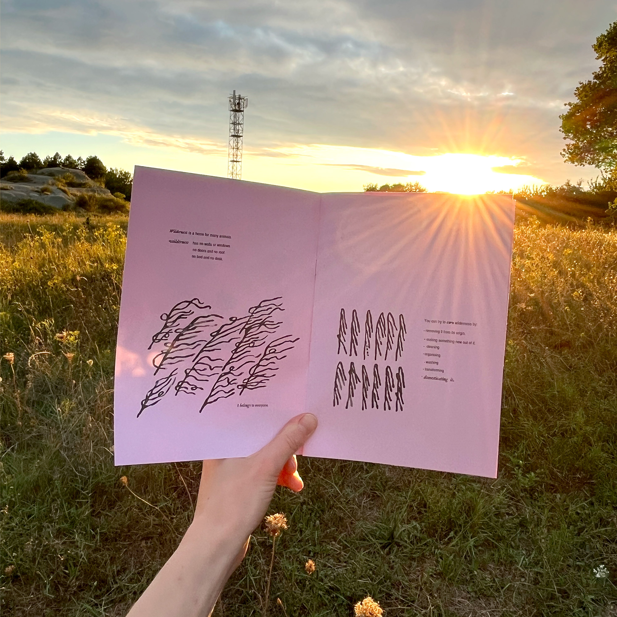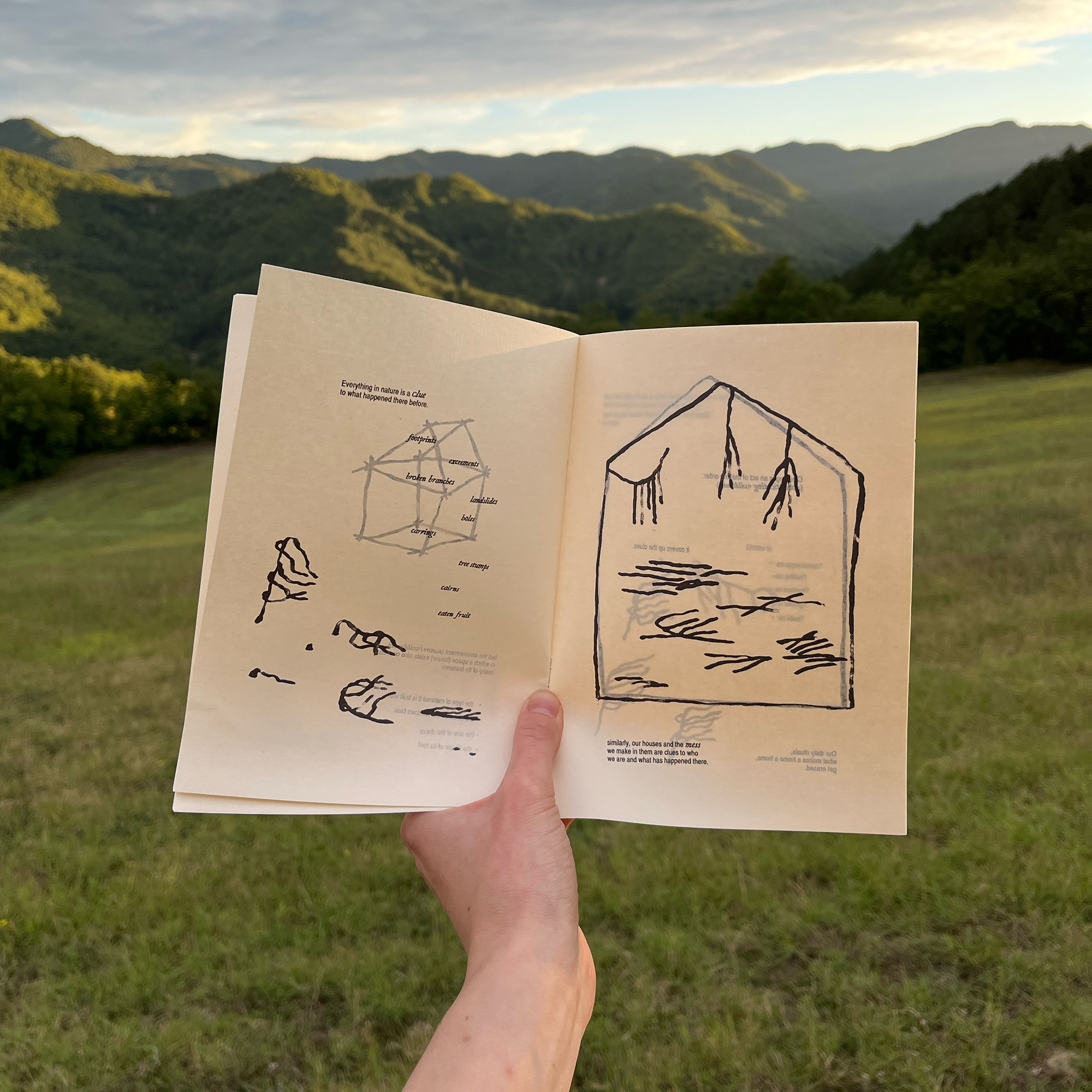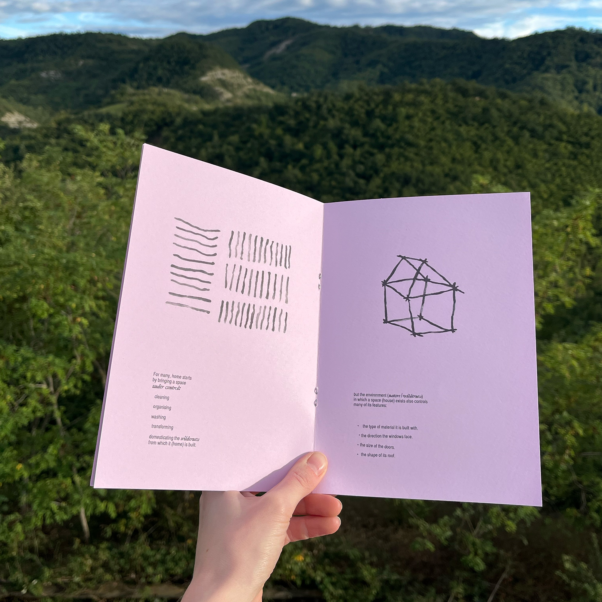 A zine exploring thoughts on the home and ownership in relation to wilderness. Made and printed at Habitat cultural center in Ca' de Monti, Italy.